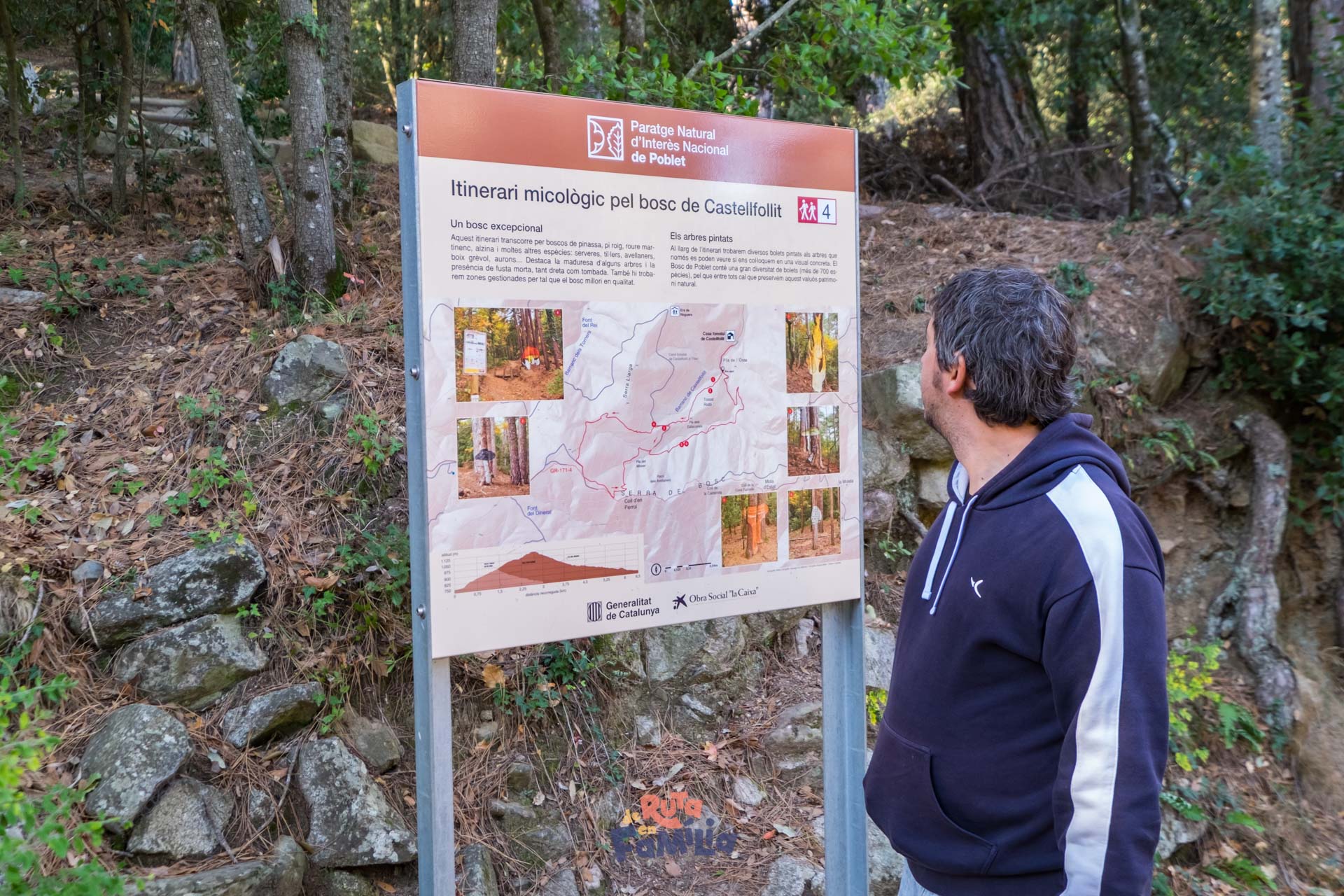 Un cop aquí, toca decidir si es continua per la ruta llarga o bé per la ruta curta. Si aneu amb nens menors de 8 o 9 anys us recomanem optar per seguir la curta. En aquest cas, tocarà tornar a la pista que a partir d’ara només té desnivell descendent per buscar els dos bolets restants i tornar al punt d’inici, la casa forestal de Castellfollit.