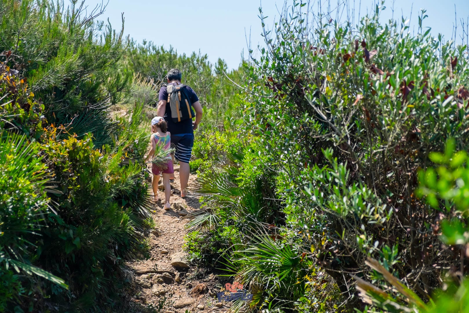 - Aneu amb calçat còmode. Una bona part del camí de ronda está urbanitzada i discorre per passarel·les de fusta o passejos asfaltats, però hi ha trams bastant extensos, especialment abans d’arribar a cala Crancs, on cal caminar entremig del bosc i per sobre de roca, així que el millor és dur calçat tancat. No calen botes de muntanya, però tampoc xancletes.