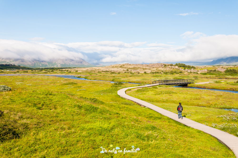 Finalmente, la última parada del Círculo Dorado es el Parque Nacional de Pingvellir, Patrimonio Mundial de la Unesco. Os aseguro que no habéis visto nunca un paisaje tan verde y tan azul y tan precioso. La llanura Pingvellir está ubicada en el límite de una placa tectónica que hace que anualmente Europa y Norte América se separen entre 1 y 18 mm. En la zona hay unas enormes fracturas, la más espectaculares de las cuales es la falla Almannagjá, que puedes atravesar por medio. El río Oxara corta la falla y termina en unas bonitas cascadas, siendo Öxarárfoss la más espectacular. A la izquierda del camino, a medida que se baja hacia Almannagjá, están los restos de algunos búdir, unos pequeños refugios que ahora funcionan como tiendas. Finalmente se llega al lago Pingvallavtn, que con 84 kilómetros cuadrados es el más grande de Islandia.