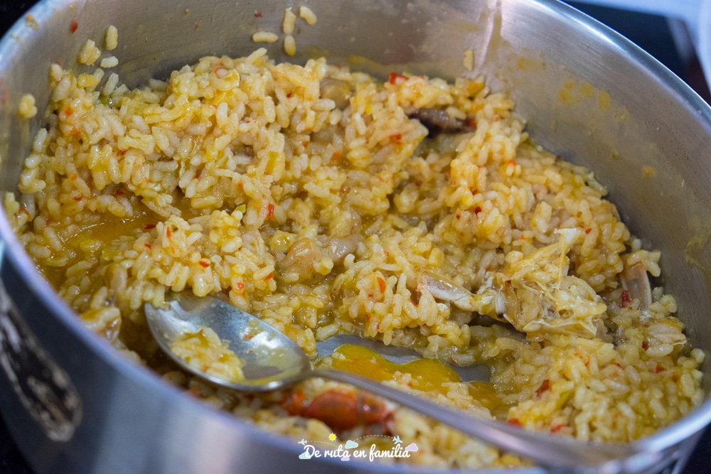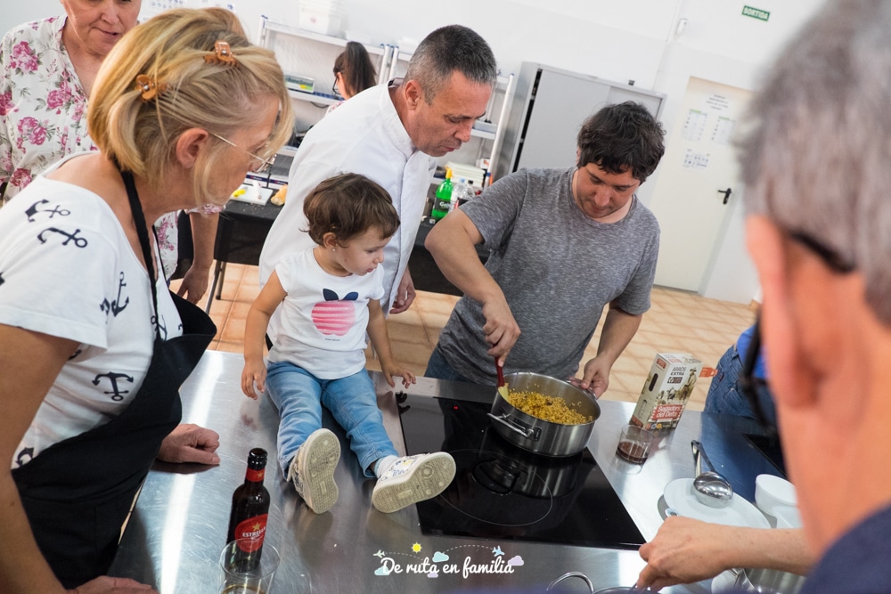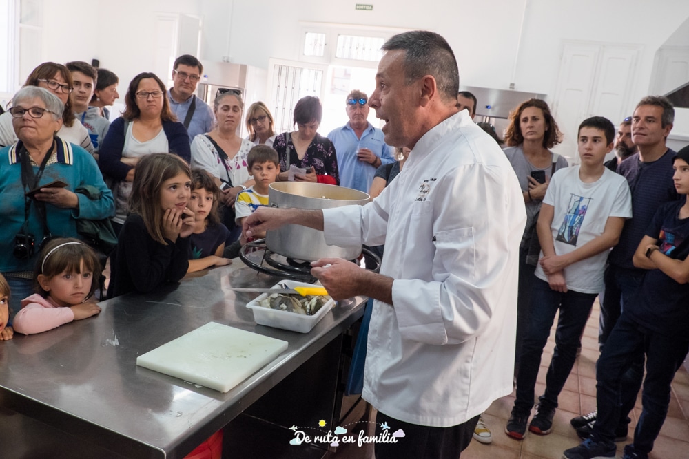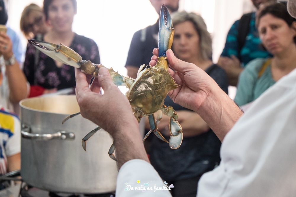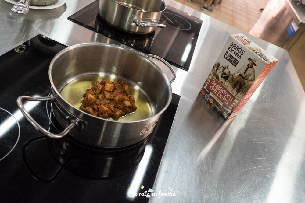 La tercera parada del día fue, sin lugar a dudas, la más sorprendente y aplaudida de todas. Era la hora de comer y poco nos podíamos imaginar que llegaríamos a una cocina de una escuela de hostelería de Deltebre donde el chef Ladis Alcalà, del Hotel Restaurante Mas Prades, nos enseñaría cómo preparar arroz de cangrejo azul.