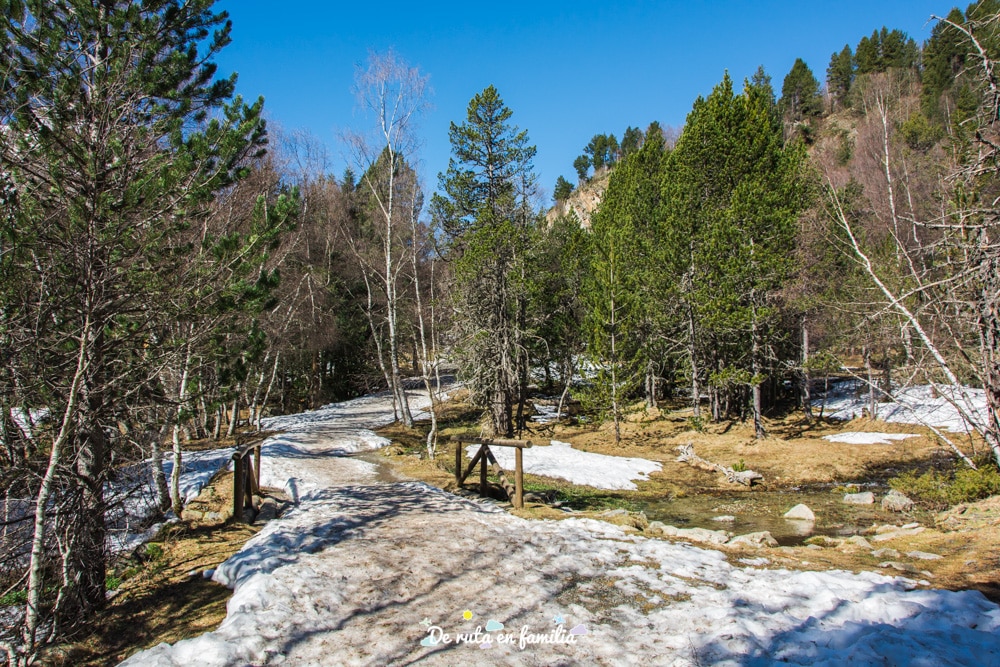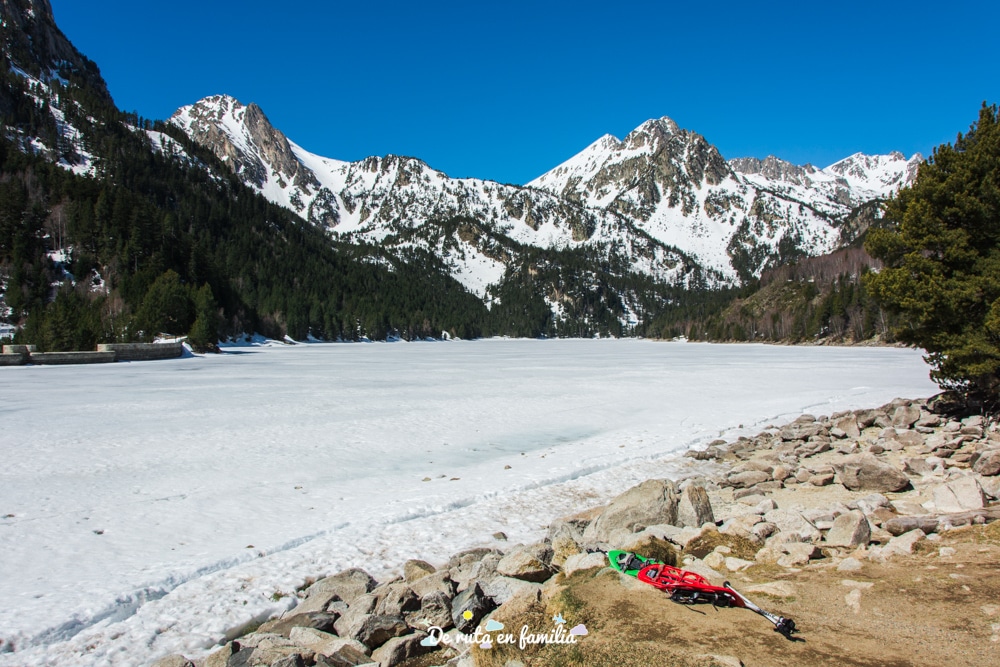 La sorpresa mayúscula nos la llevamos nada más llegar al Estany cuando vimos que aún estaba todo helado y nevado. La estampa era muy bonita y curiosa, pero también hay que decir que no aguantamos ni cinco minutos por los alrededores del lago: el viento y el frío eran horribles! Durante el ascenso estás rodeado todo el tiempo de árboles y montañas que te protegen del viento, pero una vez en el lago quedas totalmente al descubierto y a aquellas alturas la temperatura baja considerablemente durante la primavera (imaginaros en invierno…).