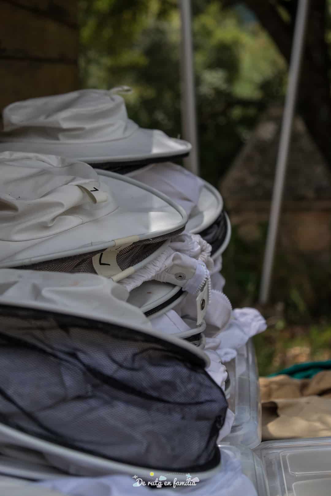 Acompañados por un guía, que se presentó como «amigo de las abejas», conocimos, en primer lugar, el entorno del Castillo de Riudabella por donde suelen moverse las abejas de la zona. Después de las fascinantes y entusiasmadas indicaciones de nuestro guía, preparamos el humo que sirve para calmarlas durante las inspecciones y nos enfundamos los trajes de apicultores.